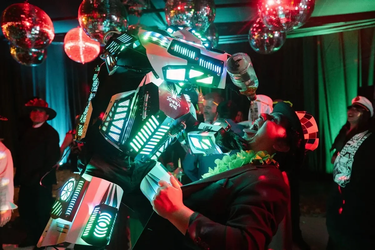 Selfie King ofrece experiencias interactivas para matrimonios. Su cabina fotográfica captura momentos únicos con tiras personalizadas, más plataforma 360° para videos de efecto infinito, túneles LED que crean momentos mágicos y shows de luces con robots que deslumbran a los invitados.