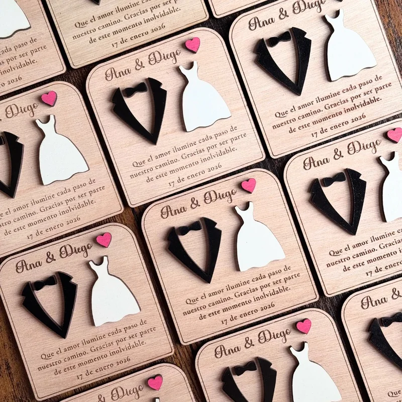 Souvenirs de matrimonio personalizados en madera y acrílico, diseñados para que tus invitados se lleven un recuerdo especial de tu gran día. Cada pieza se crea a medida, cuidando los detalles para reflejar el estilo de los novios y su celebración.